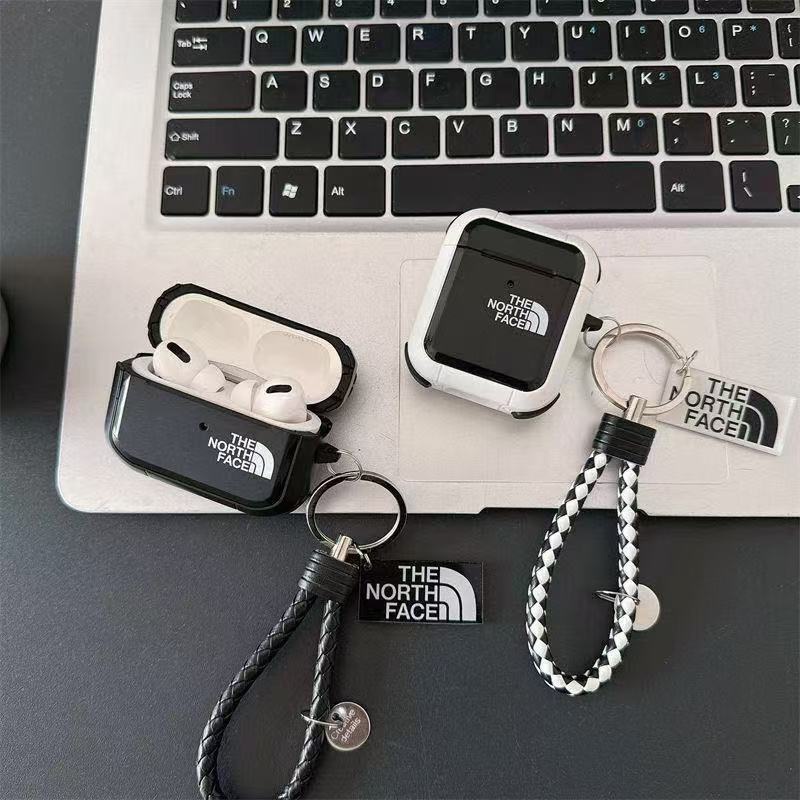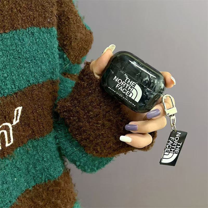 ノースフェイス 黒貝殻模様 耐衝撃イヤホンケース!シリコンソフトシェル+メタルフック、アウトドア派のAirPods Pro 2専用カバー、ハードコアなミリタリースタイル!収納力抜群:イヤホン、USBケ.....